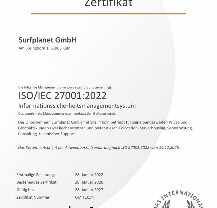 Seit dem 28.02.2022 ist die Surfplanet GmbH ISO27001 zertifiziert.